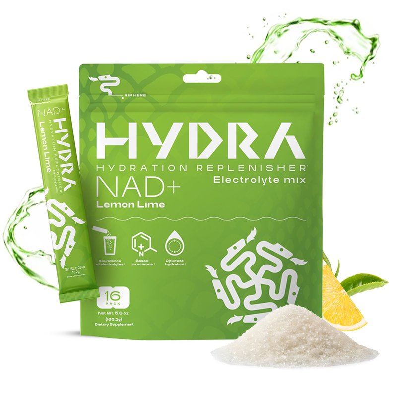 Stay hydrated and replenish your body with HYDRA HYDRATION REPLENISHER WITH NAD+ packets. These convenient electrolyte packets are perfect for sports hydration, providing essential electrolytes and nutrients to keep you performing at your best. With low sodium and low sugar, this electrolyte drink mix is a healthier choice for your active lifestyle. Each box contains 16 lemon lime flavored packets, ensuring a delicious and refreshing taste. Don't let dehydration slow you down - fuel your body with Hydra Powders electrolyte drinks and conquer your workouts with ease. Quench your thirst and replenish your electrolytes with our delicious electrolyte drinks. These electrolyte powder packets blend lemon lime flavor with functionality, making it easier than ever to stay hydrated and maintain optimal electrolyte balance. NAD+ increases collagen production, increases energy, boosts metabolism, DNA repair, increases memory, mental focus and muscle endurance. 1 stick contains: - 100 mg Nicotinamide Riboside (NAD+) - 6 key electrolytes - 578% dv Vitamin C for immunity - 208% dv Vitamin B12 & B6 for hydrating your skin and preventing bloating - Zinc - BCAAs for workout recovery - 500mg Coconut Water Powder - Aquamin F for trace minerals - Calcium - Vitamin B3 Low sugar, vegan, keto friendly, natural and NON-GMO. For a refreshing and revitalizing experience, choose our hydration supplements - your key to wellness and well-being.