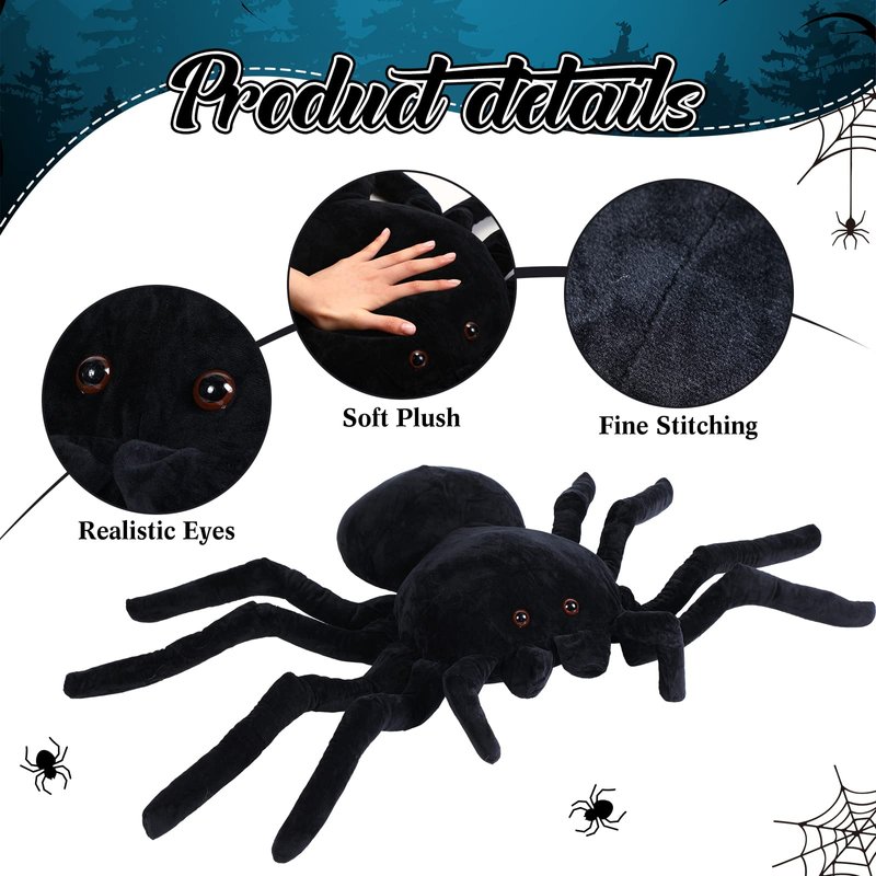 - Realistic Appearance: the giant spider plush is designed in black all over with 8 long legs, which is vivid and realistic, suitable for people of all ages; Note: the giant spider is vacuum packed, so it will be a bit flat; Please leave it for a moment after opening and restore it immediately
