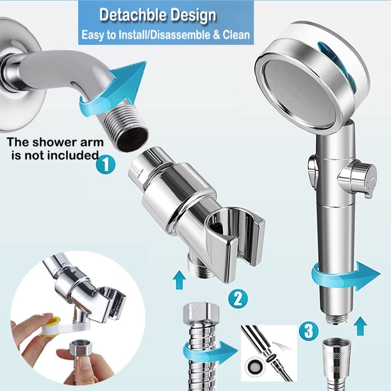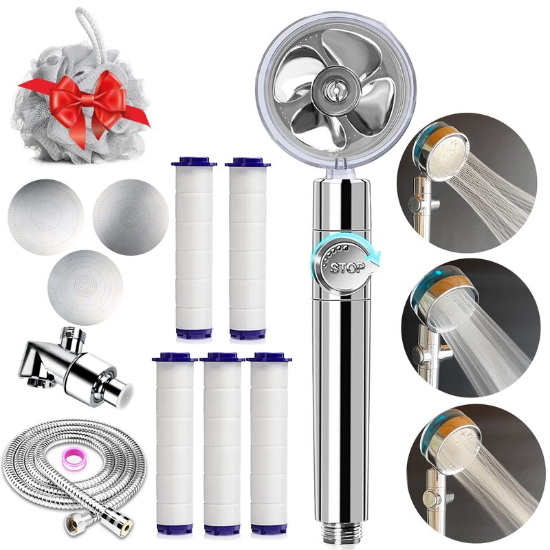 - 【360 DEGREES FREE ROTATION & ADJUSTABLE】- 360°universal rotation, you can freely adjust the turbo shower head to a comfortable angle, allowing you to enjoy bathing fun in all directions. The Turbo shower head has an independent pause switch + a button to adjust the water size. It's more convenient to turn on or turn off the water when you use our propeller shower head, and the vortex shower heads to save water at the same time