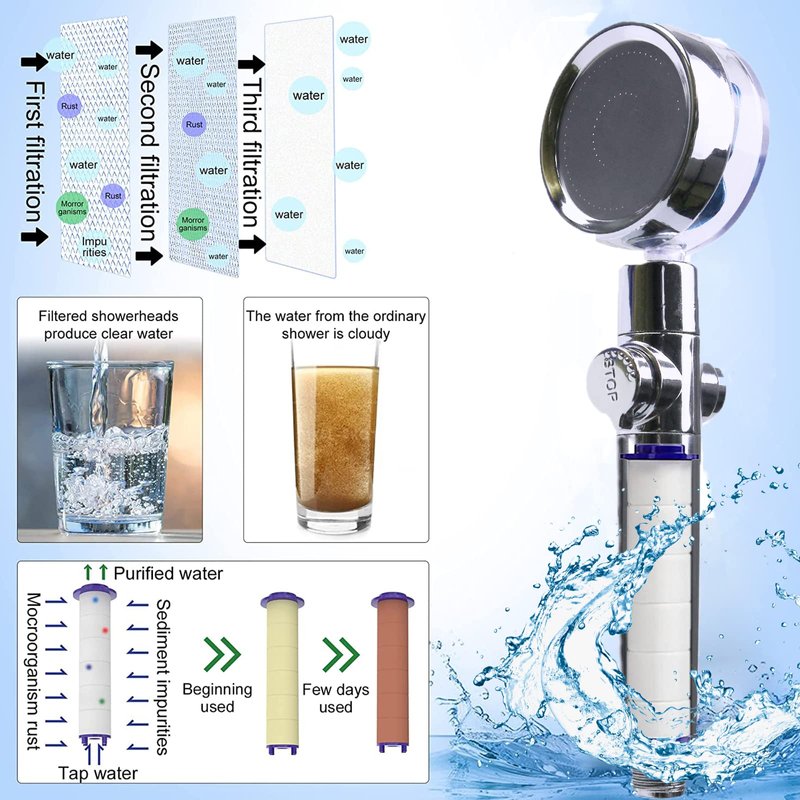 - 【FILTER SYSTEM】- Our filtered shower head with upgraded triple filtration function. The clean cotton filter can effectively remove impurities in the water, such as dirt and heavy metal, and the turbo shower head protects the health and safety of your family's skin. 4pcs extra cotton filters are prepared for you. Recommend to replace it every 4-6 weeks