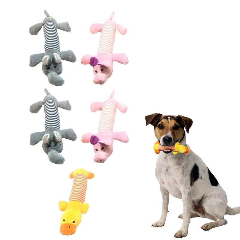 Introducing the Plush Pals Squeaky Dog Chew Toy Bundle! Are you ready to treat your pup to a symphony of squeaks and a parade of plushness? Look no further than our Plush Pals Squeaky Dog Chew Toy Bundle! It's not just a bundle; it's a carnival of cuteness with two elephants, two pigs, and a duck – because every dog deserves a plushy playtime extravaganza! Bring the fun of the carnival indoors! Plush Pals is the perfect bundle for keeping your dog entertained on rainy days, lazy afternoons, or any time your pup craves a plushy playdate. It's an indoor carnival that never ends! Every dog has its preference, and with Plush Pals, you cater to them all. Whether your furry friend loves a trunk to tug, a pig to pounce on, or a duck to dance with, this bundle has it all – ensuring there's never a dull moment in your pup's playtime. Treat your fur baby to a bundle of joy with Plush Pals – where squeaks, snuggles, and smiles come together in a plushy paradise. Don't miss out on the fun – grab your bundle today and let the squeaky festivities begin!