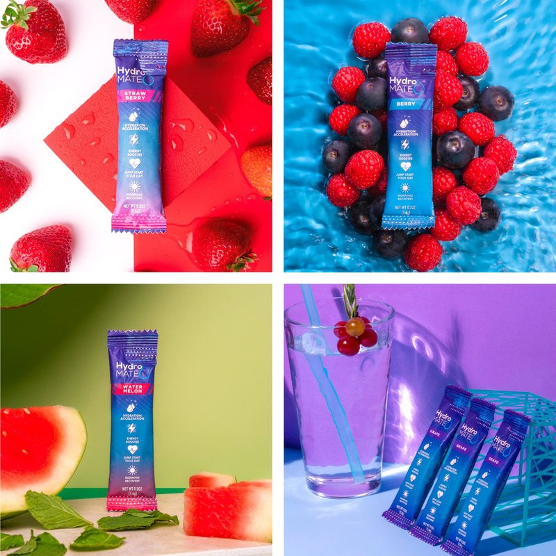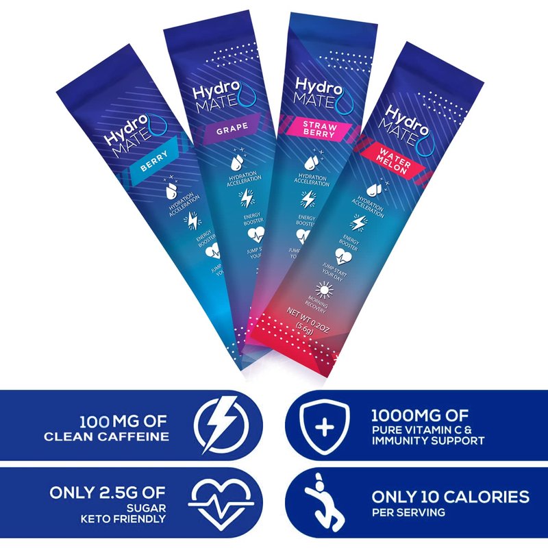 HydroMATE Hydration Accelerator Electrolyte Supplement Drink Mix Rapid Hydration Hydrate Powder Packets Multiply Your Hydration Low Sugar Single Serving Stick Rehydrate Fast Variety Pack 3x More Hydration than Water Alone Essential Vitamins Immune Support Party Vitamin C Award Taste Vacation Essentials HydroMATE Hydration Acceleration Hydration Packets are a Bachelorette Party Favors a Kit Must Haves for Beach Cruise Vacation Girls Trips Weekend Supplies HydroMate Multi Flavor Variety Pack Bag includes four Water Flavors Watermelon Strawberry Grape Berry 3x Faster Hydration than Water Alone HydroMATE looking for a kit bachelorette party bridesmaid gifts for wedding day bachelor girls weekend or an adult party favor Just 10 Calories 2.5g of sugar is a great low sugar water flavor with rehydrating electrolytes to fight dehydration with less sugar than traditional liquid sports drinks Hydro MATE Electrolyte Rehydration packets Rehydrate fast without an IV aid in dehydration relief with out needing Multiple Hours of Relief