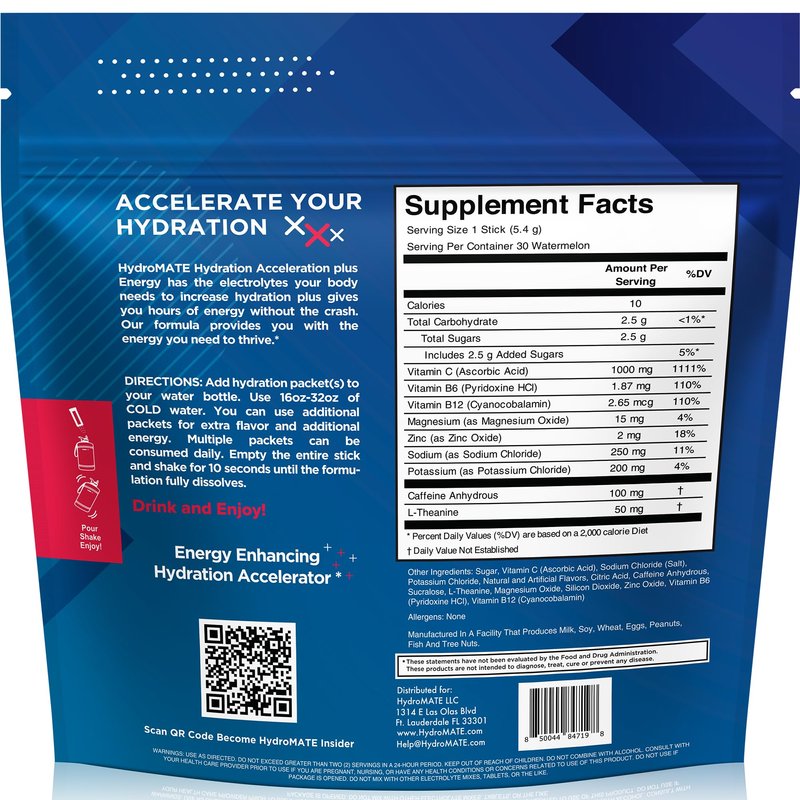HydroMATE Electrolytes Powder Drink Mix Packets Hydration Accelerator Low Sugar Rapid Party Relief Recovery Vitamin C Plus Caffeine Watermelon 30 Count