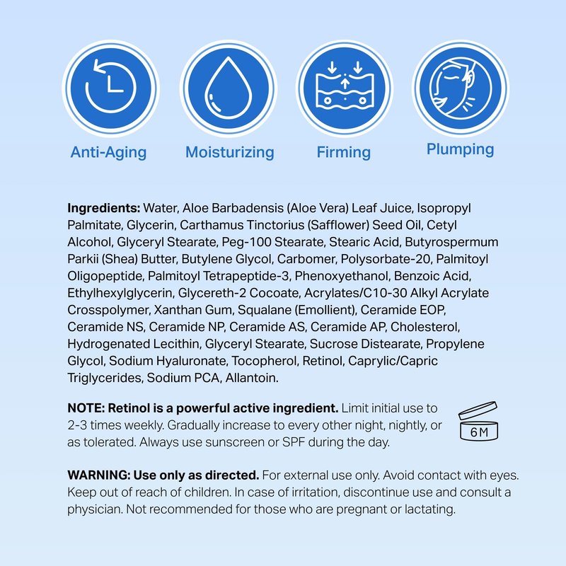 - KEY INGREDIENTS: Retinol (0.1%), Bio-Active Ceramides, Polypeptide Complex (peptides), Capric Triglycerides, Glycerin, Vitamin E (Tocopherol), Aloe Vera Extract, Shea Butter, Allantoin, Hyaluronic Acid (Sodium Hyaluronate Acid).