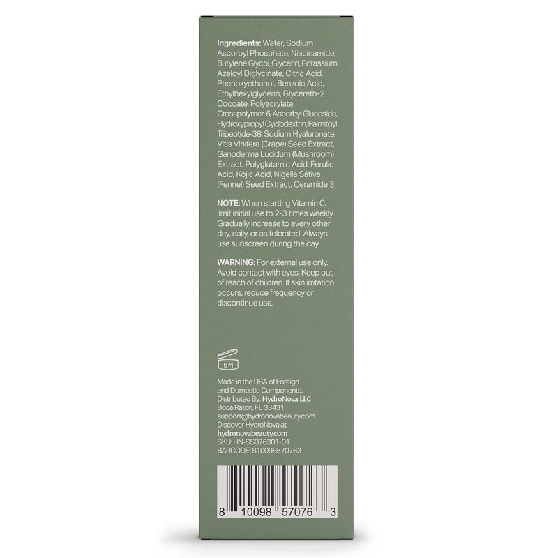 - KEY INGREDIENTS: Vitamin C (Sodium Ascorbyl Phosphate), Niacinamide, Kojic Acid, Ferulic Acid, Glycerin, Hyaluronic Acid, Polypeptides, Grape Seed Extract, Reishi Extract, Black Seed Extract.