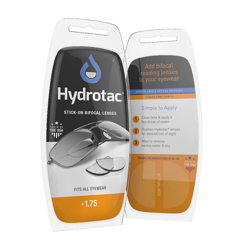 Hydrotac lenses turn any eyewear into reading glasses with superior clarity. Adhere with just a drop of water! Lenses are removable and reusable.