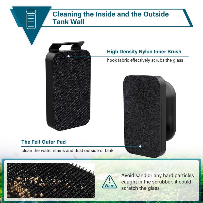 - 【Fish Tank Algea Tool】The cleaning scrubber consists of two piece magnetic brush, an inner brush has a velcro-hooks surface for scrub the algae of the glass and a handle brush has felt pad surface also can wipes dust and water stains from the outside.(Warn: don’t get sand stuck in the pad and could scratch your glass)