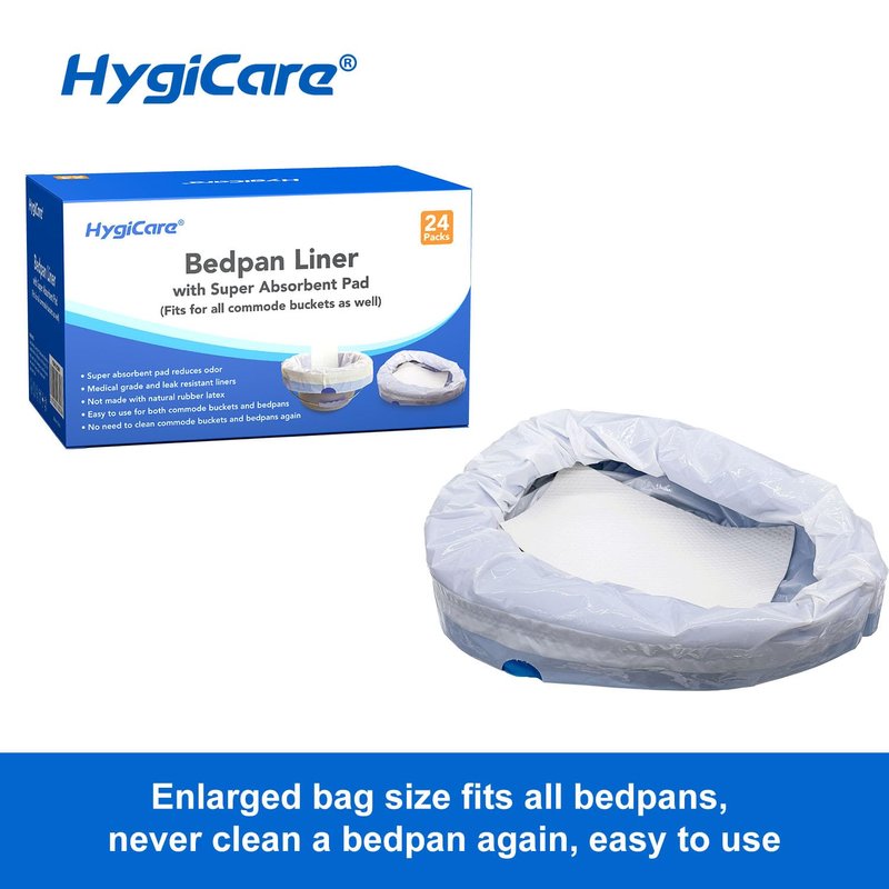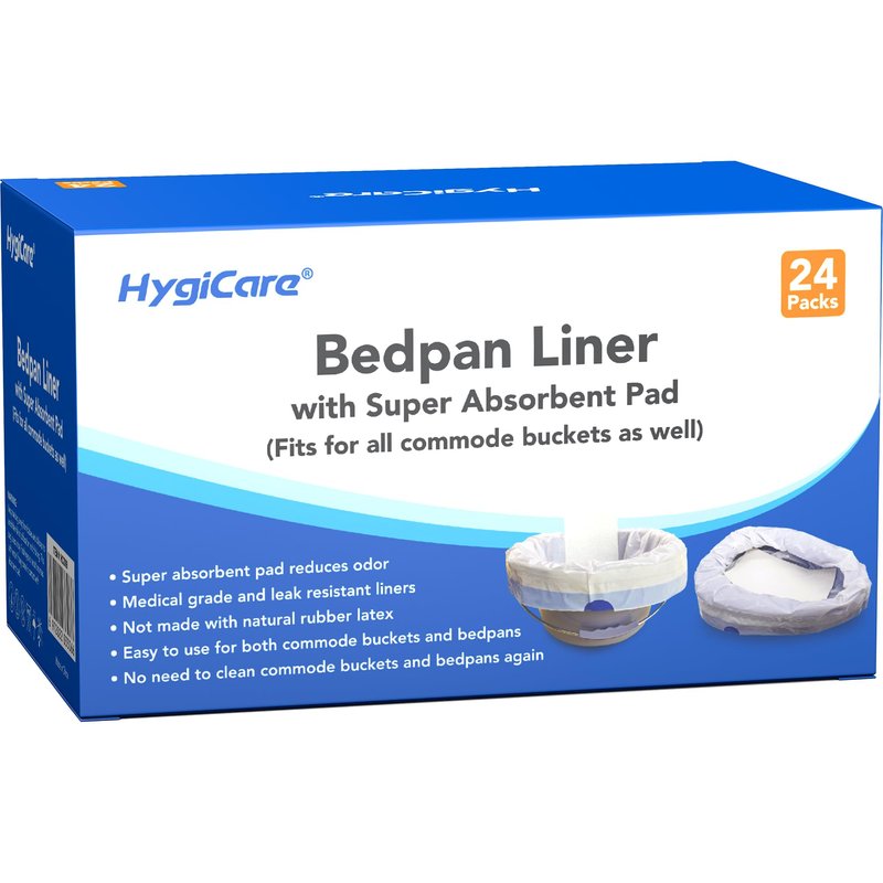 HygiCare Bedpan Liners with Super Absorbent Pads - 24 Count Universal Fit, Medical Grade, Leakproof, Odor Reducing, For Bedside Commodes