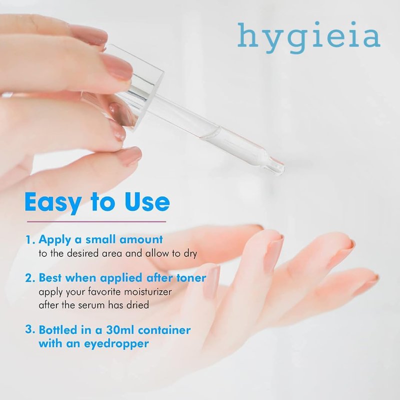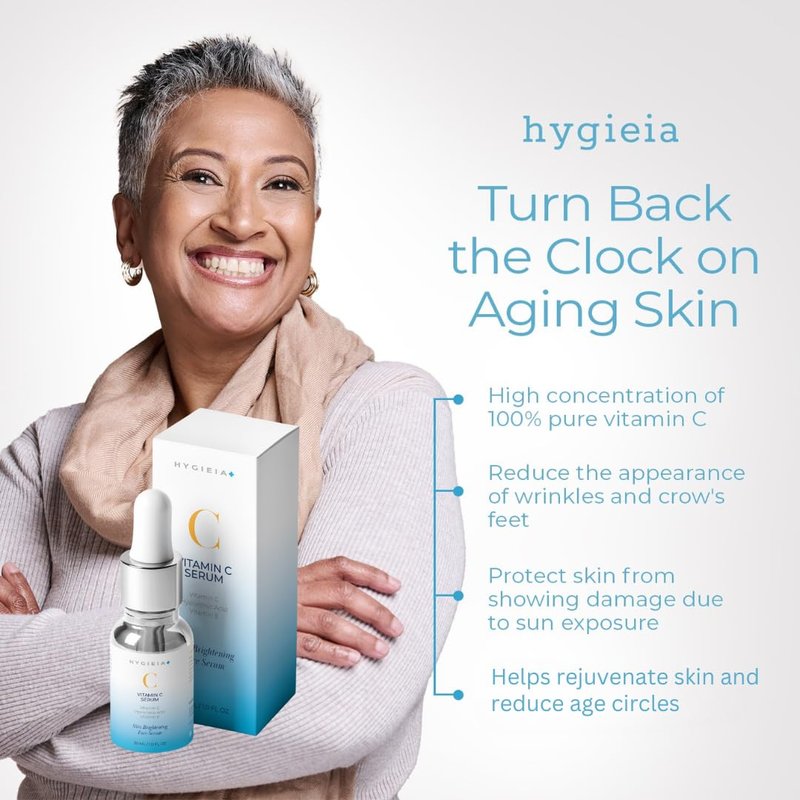 HYGIEIA VITAMIN C SERUM: Revitalize and detoxify aging skin with this revitalizing Vitamin C Serum. Formulated to protect and promote collagen, this face serum for glowing skin delivers nutrients and antioxidants that reduce the look of hyperpigmentation and leave skin with an even and radiant tone. This hydrating face serum combats free radicals (compounds that can damage cells if they build up too much) from sun and pollution exposure. Along with age spot correcting Vitamin C, this reviving facial serum contains complementary anti-aging ingredients to maximize results – Hyaluronic Acid floods skin with moisture to firm and plump, reducing the appearance of lines and wrinkles, while Vitamin E nourishes and balances moisture levels, for a dewy, youthful complexion. This antioxidant face serum supports existing collagen along with boosting collagen production to renew and rejuvenate dull, tired and crepey skin from within, leading to improved firmness and skin elasticity. Formulated without parabens or sulfates, our cruelty free Vitamin C face serum is made in a professional laboratory. This thick, luxurious facial serum should be used as a daily moisturizer serum and is engineered to support our liposomal face cream selection, thereby intensifying and accelerating desired results. Just apply a small amount of Vitamin C and E serum to the fingertips and massage into the face, neck and décolleté after toning, before applying anti-aging moisturizer. Hygieia combines technology with natural ingredients to create cutting edge anti-aging skin care products that protect, nourish and reveal the radiance of healthy skin. Our brand is inspired by Hygieia, the goddess of health, strength, supernatural beauty and eternal life, and our mission is to help keep skin looking vibrant and youthful at every age.