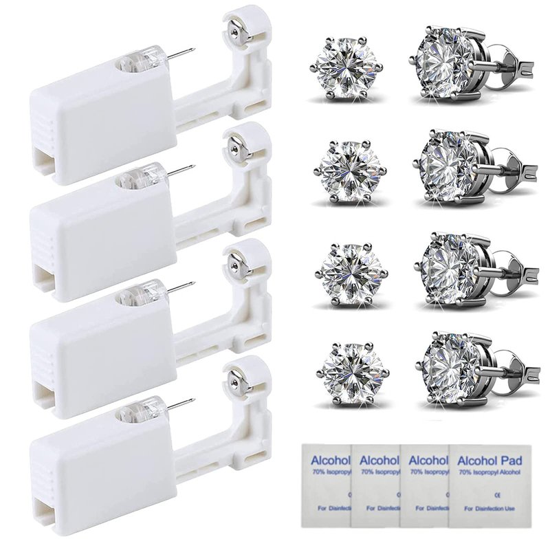 - 【Ear Piercing Kit】 Each package contains 4 pack ear piercing gun, 4 pairs of 5mm silver diamond stud earrings (Built-in the ear pierce gun) with 4 cleaning cotton pads