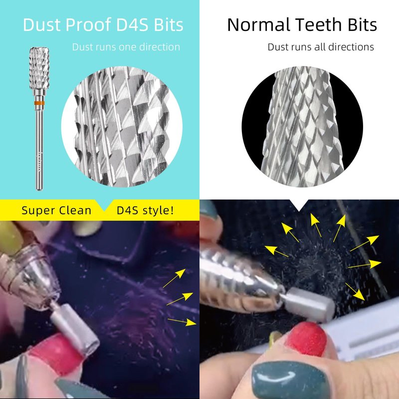 - hytoos dust proof super clean nail drill bit, with sharp right-rotation and special D4S styel cut teeth, fast to remove nails gel works, important that on working the nail dust runs in one direction(but the normal bits dust runs all directions), that is good for manicurist, and flat top design safety for customers, top chamfer teeth can use for fingernail edge gel and cuticle clean. Use regular barrel shape, pro manicurist or new poeple, very easy to use.