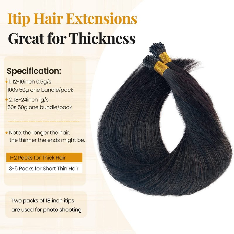 - 【Hair Specifications: Keratin I Tips Real Hair Extensions】12 inch/14inch/16inch with 100strands 50grams per pack; 18inch/20inch/22inch/24inch with 50strands 50grams per pack; Just like tape in extensions, 1-2 packs for thick hair or to fill the gaps or to use with sew in together; 3-4 packs for short thin hair to make hair thicker and longer