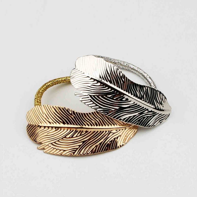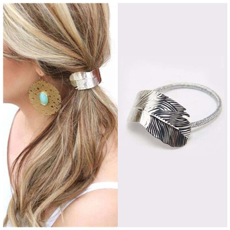 Iaceble Boho Silver Leaf Hair Tie Hairband Ponytail Holder Hair Rope Minimalist Leaf Hair Band Rope Metal Feather Hair Scrunchies Hair Tie Decorative Hair Accessories for Women and Girl Headdress