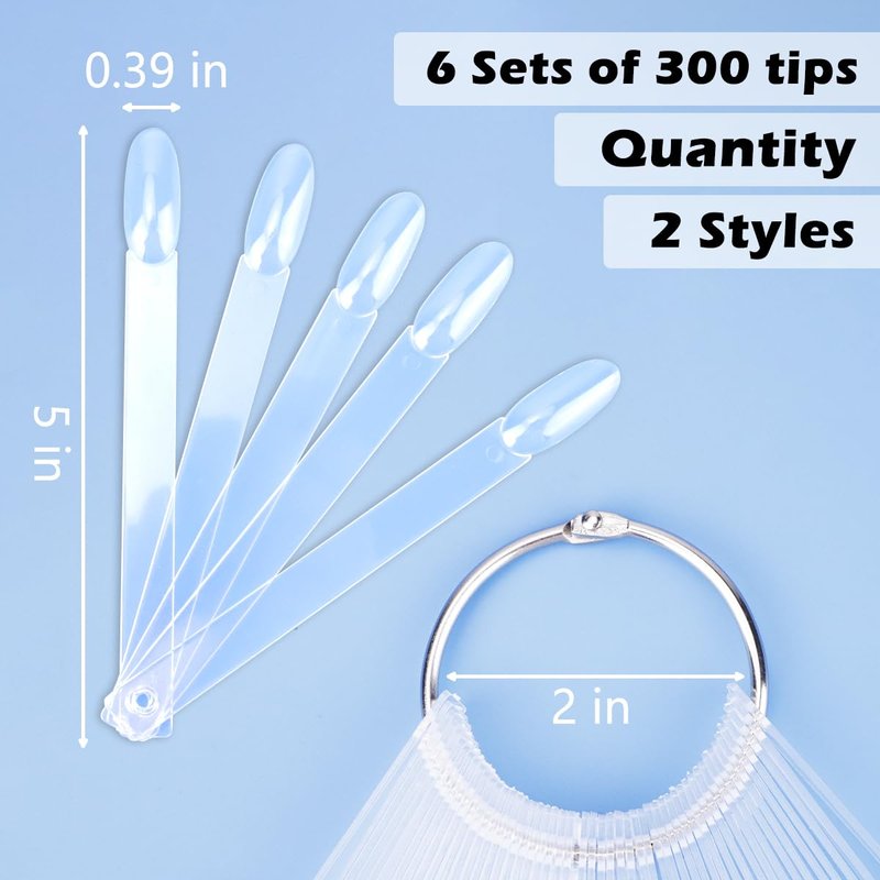 IBEQUEM 300Pcs Clear Nail Swatch Sticks with Ring, 2 Styles Fan-Shaped Nail Art Polish Display Tips, False Nail Sample Sticks, Nail Practice Color Display Polish Board for Nail Art Polish, Salon, DIY