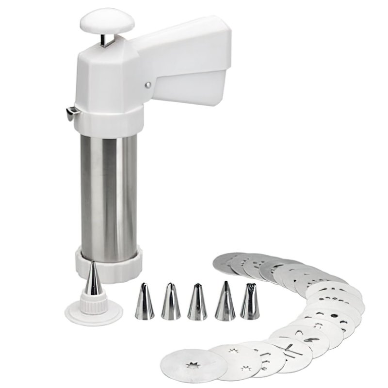 - Includes 10 variated cookie press discs and 8 interchangeable nozzles