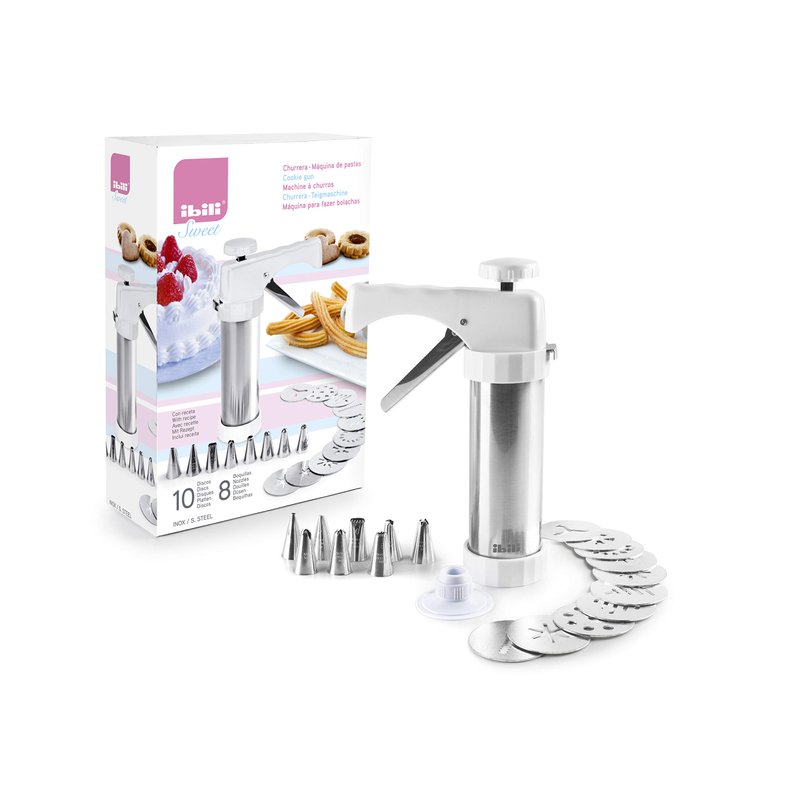 Ibili Cookie Press Gun, 18/10 INOX Stainless Steel Cookie Press for Baking, Dishwasher Safe, Includes 10 Variated Discs and 8 Interchangeable Nozzles - Made in Spain