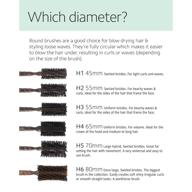 - H5 / 70mm - Round brush with hybrid swirled boar / carbon fiber nylon bristles & hardwood handle.