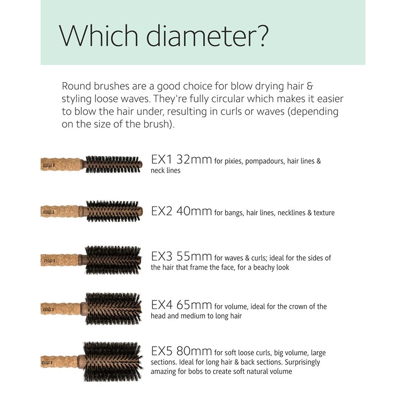 - Available in 5 sizes, the EX series is the most innovative design in ergonomics in a round brush EVER! Light weight and easy to maneuver. Extra dense reinforced boar for the practitioner of high performance styling.