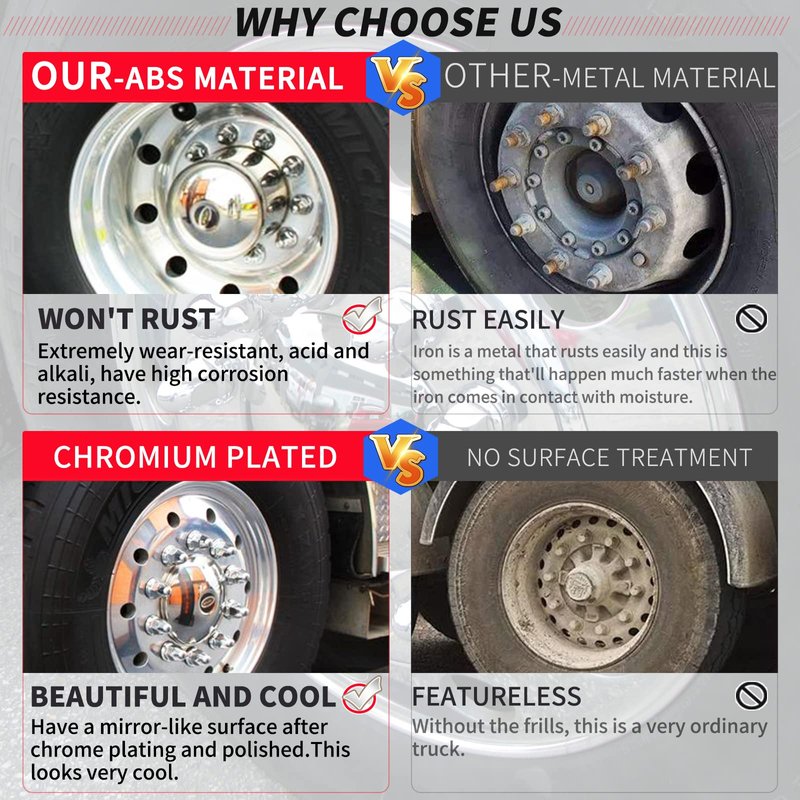 - 【BEAUTIFUL AND WON'T RUST】The lug nut covers are made of high quality ABS which has a mirror-like surface after chrome plating and polished.They resist wear and corrosion.Won't rust like the metal ones.