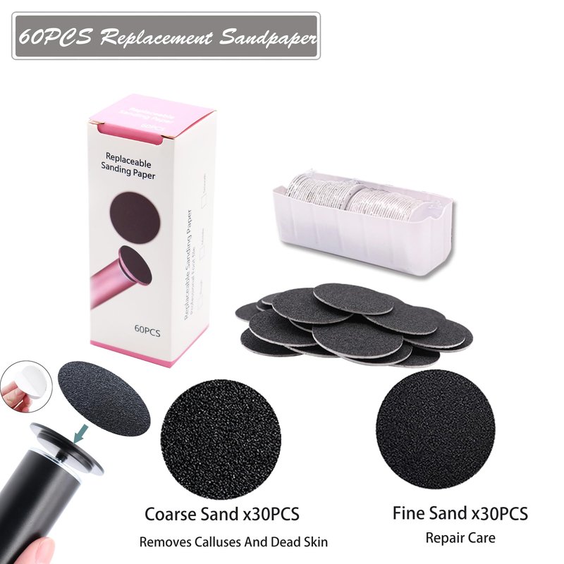 - 【With 60PCS Self-adhesive Replaceble Sandpaper Discs】Self-adhesive sandpaper,easy to paste and replace. With 60pcs replaceble sandpaper discs, meeting your different needs. (30 pieces rough sandpaper, suitable for quite dry and rough heels, and the other 30 pieces is fine sandpaper,which is more suitable for soft skin), meeting your different needs.