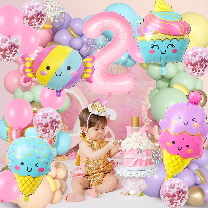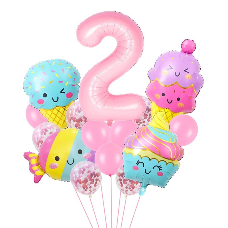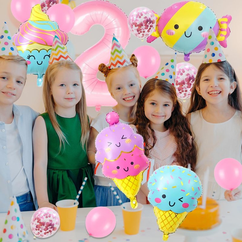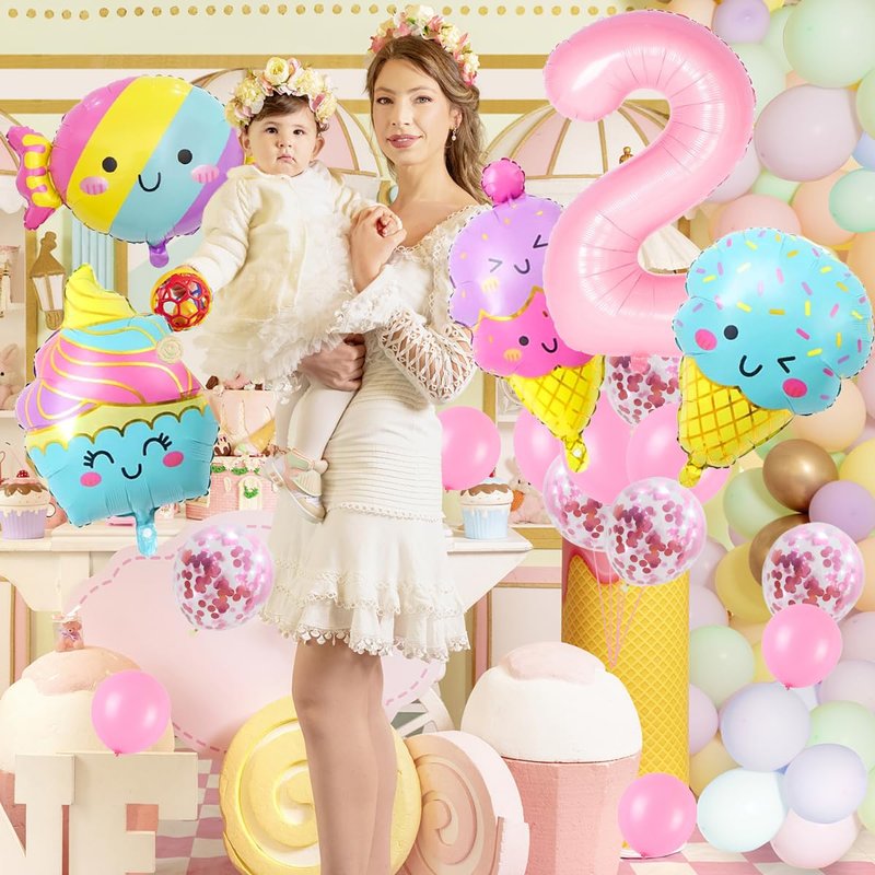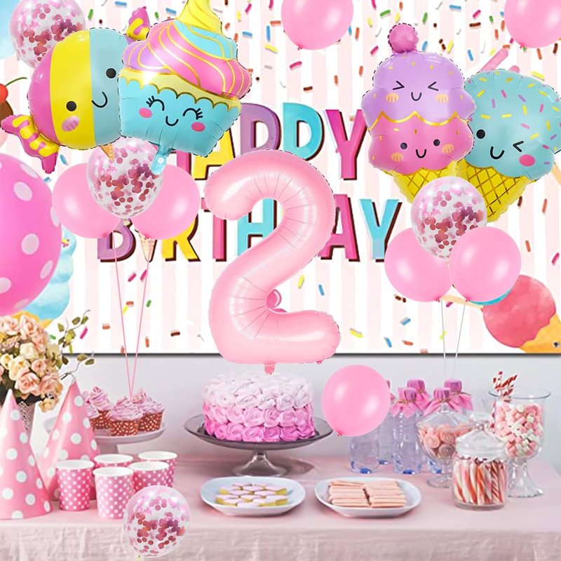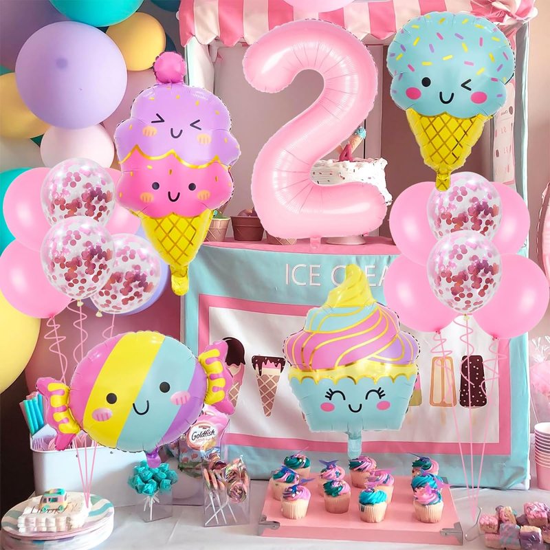- Ice Cream themed Party Decorations: 1PCS pink 2 balloon 40 inch, 1PCS candy balloons, 3PCS ice cream balloons, 5PCS pink balloons, 5PCS pink confetti balloons.