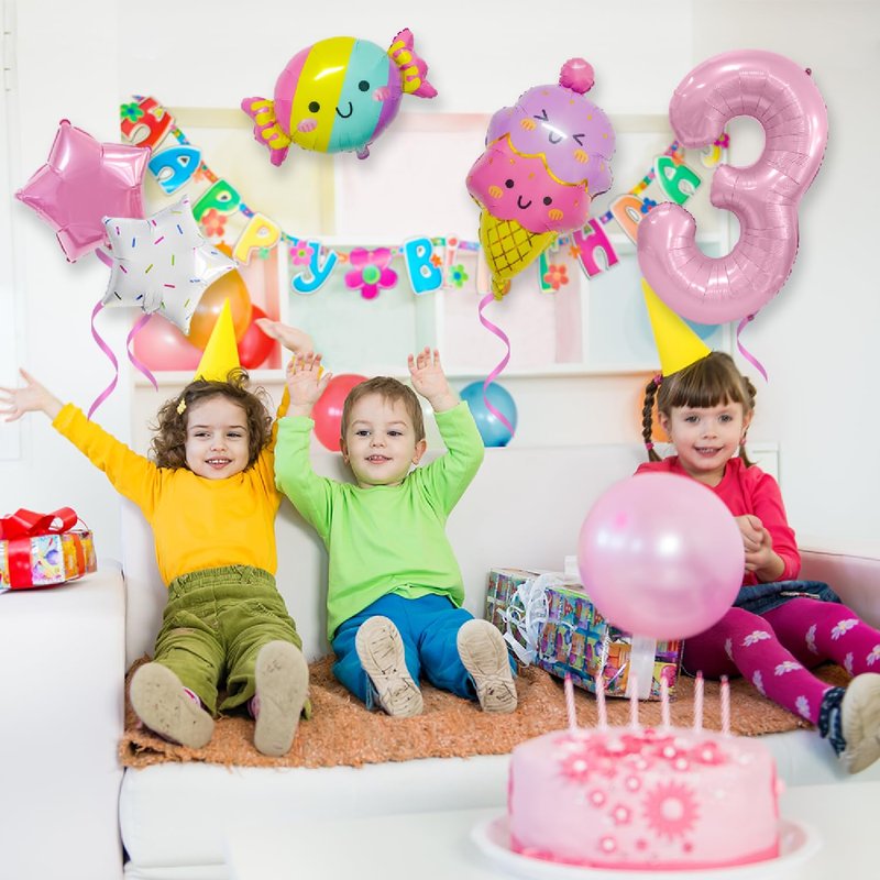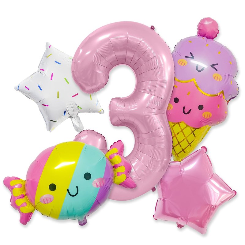 - Package include: 1*32” pink balloon (Number 3), 2* 18” star balloons, 1* 25” candy balloon, 1*26” ice cream balloon.