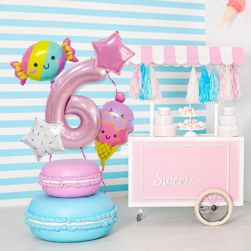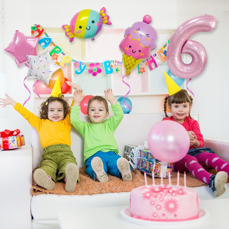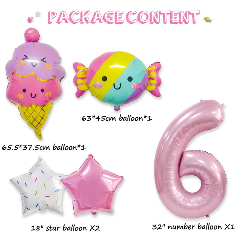 - Package include: 1*32” pink balloon (Number 6), 2* 18” star balloons, 1* 25” candy balloon, 1*26” ice cream balloon.