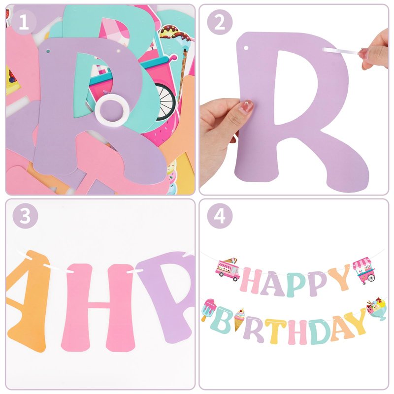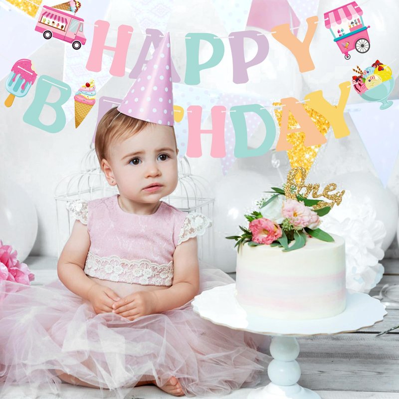 - Ice cream birthday decorations: Ice cream birthday banner to spice up your ice cream party decorations. It can be easily added to any wall, fireplace, ceiling, window, gift dessert table, mantel, doorway, archway as a colorful garland and can also be used as a photo background