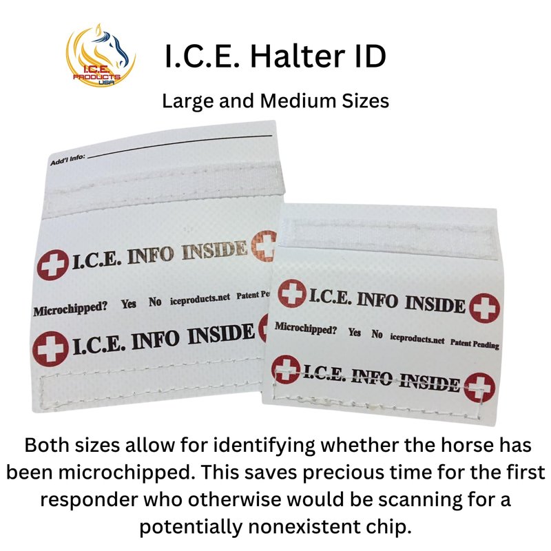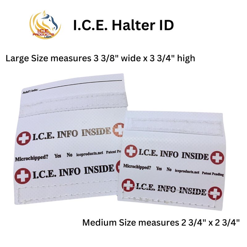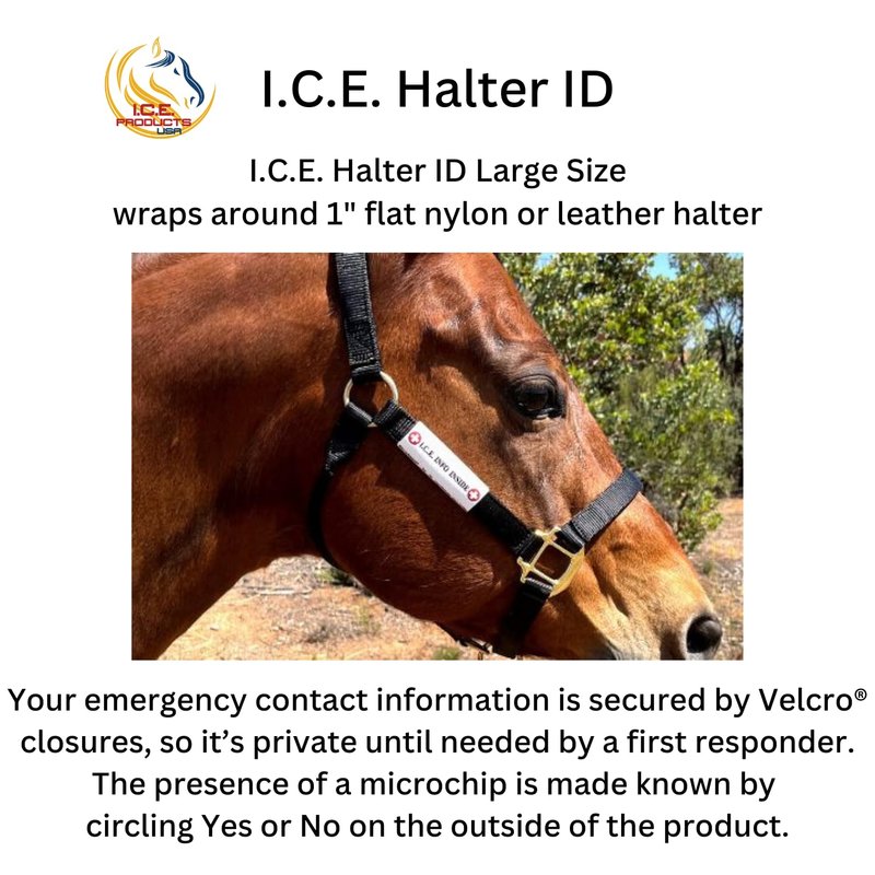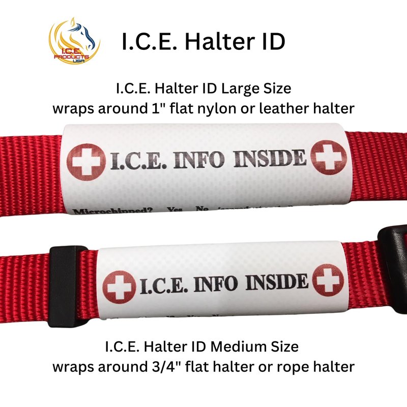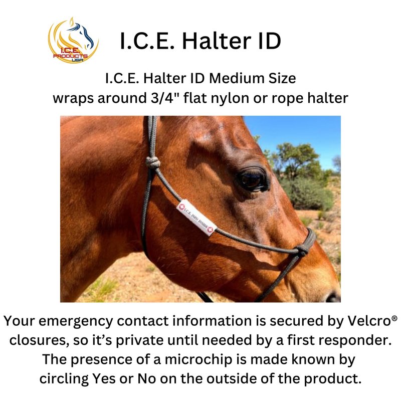 - Identification Aid: This halter ID displays 'I.C.E. INFO INSIDE' to indicate important emergency contact and medical details for the horse.
