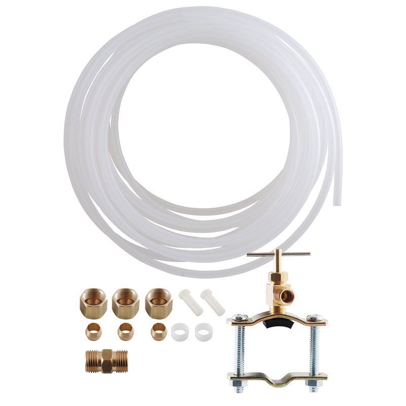 - COMPLETE INSTALLATION KIT includes poly tubing, self-piercing saddle valve, and fittings This universal, all-inclusive kit is designed with metal fittings to ensure a solid and dependable connection. Included instructions make DIY installation a breeze!