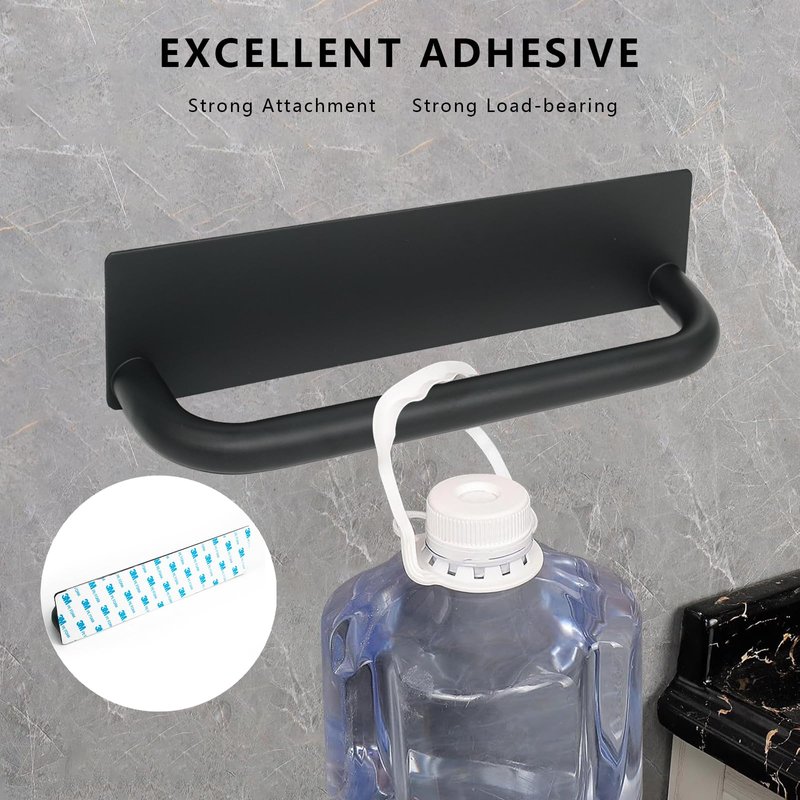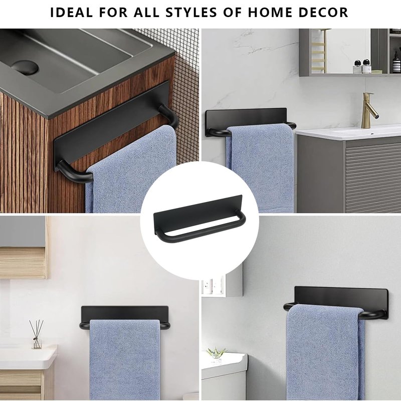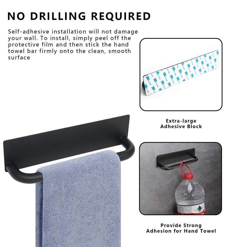This small peel and stick towel holder is designed to provide a stylish yet functional solution without the hassle of drilling. Perfect for any bathroom or kitchen, this adhesive towel rack offers a compact and durable option for mounting hand towel racks effortlessly on your wall. The 9-inch black bar is constructed from high-quality, rust-resistant stainless steel that promises longevity and strength. The self-adhesive towel holder design uses Command Strip technology to ensure a secure and long-lasting hold while allowing easy removal when needed, leaving no residue or damage to your walls. Ideal for those who prefer no-drill towel holders but still want reliability and ease of installation. This adhesive kitchen towel holder can be easily mounted by simply peeling off the backing and sticking it to a clean surface. Its waterproof feature makes it suitable for wet environments like bathrooms. Whether you need a hand towel bar in the bathroom or a kitchen hand towel holder in the kitchen, this adhesive hand towel holder is versatile and reliable. The stick-on towel rack is small and compact, making it an excellent choice for areas with limited space. With its modern design and strong adhesive, it complements any decor style. Say goodbye to complicated installations; this adhesive towel bar is ready to use right out of the box. Enjoy the convenience of hand towel racks for bathroom or kitchen towel racks without compromising on aesthetics or durability. Ideal as a bathroom hand towel holder, kitchen hand towel holder, or wall-mounted accessory, this hand towel holder for bathroom wall provides a simple yet elegant way to keep towels organized. Compact and sturdy, it’s perfect for small spaces, offering multiple mounting options with a strong, reliable grip. Try the self-adhesive towel holder and experience the benefits of a hand towel holder adhesive, Command hand towel holder, or Command towel bar that fits seamlessly into your daily routine.