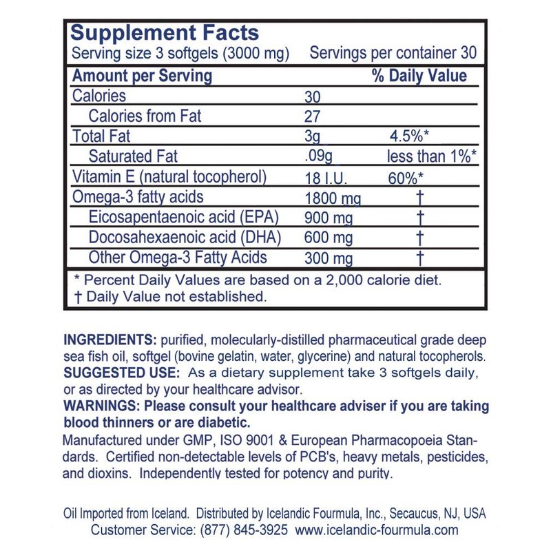 Icelandic Fourmula delivers the most EPA, DHA and TOTAL OMEGA-3 Per Serving. Provides at least 3000mg per serving to support YOUR ACTIVE LIFESTYLE. Additionally it is QUADRUPLE STRENGTH and delivers FOUR TIMES the health benefits. We only use Premium and lab-tested pharmaceutical-grade Omega-3 Fish Oil. Icelandic Fourmula contains CLEAN, PURE Omega-3 Fish Oil from Iceland the country that practically invented the stuff! Each serving contains 1800mg of Omega 3, 900mg EPA, 600mg DHA!