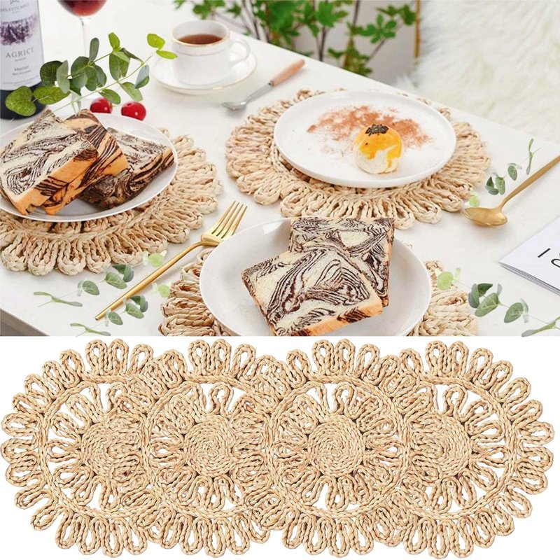 - Natural woven placemats, set of 4, adding a touch of nature and boho style to your dining table.