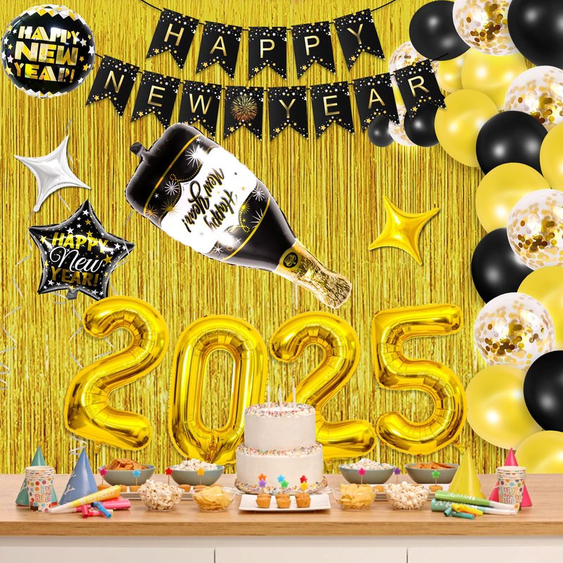 - 【New Years Decorations 2025】: Package includes Happy New Year banner *1, golden foil curtain *2, "2025" number foil balloons *1, black balloon *14, gold balloon *16, sequined balloons *7, champagne bottle balloon *1, pentagram foil balloon *1, round foil balloon *1, silver & golden star foil balloon *2, glue point *1, ribbon *1.