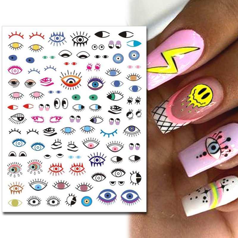 IDDFEVE 12 Sheets Abstract Smiling Face & Evil Eye Nail Art Stickers, 3D Funny Nail Decals Self-Adhesive Designs