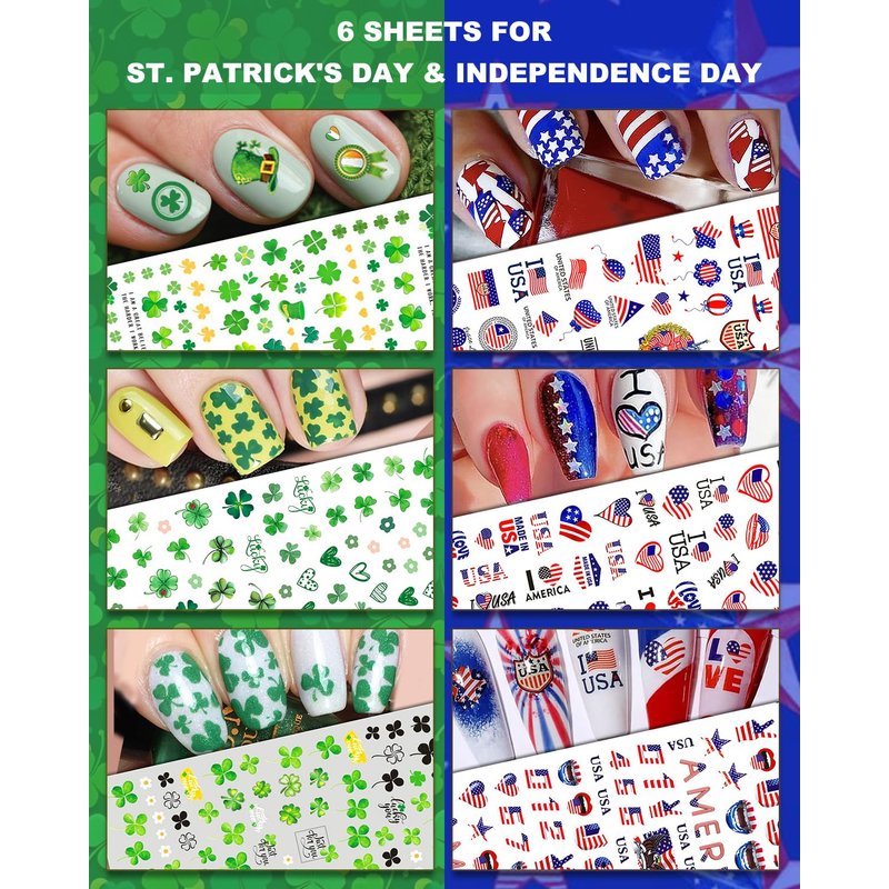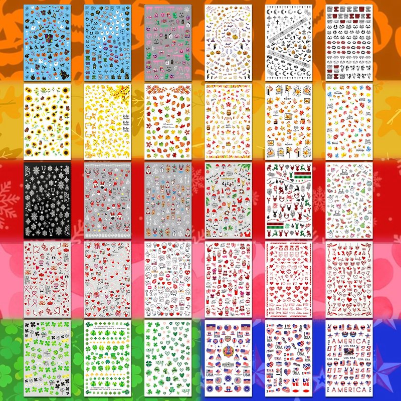 - Year-Round Fun - Grab our 30-sheet set of nail stickers for every season and holiday! With 6 sheets each for Christmas, Halloween, Thanksgiving, Valentine's Day, plus 3 for St. Patrick's Day and July 4th, you're covered all year. From pumpkins and spider webs to Santa, snowflakes, maple leaves, turkeys, hearts, four-leaf clovers, and the U.S. flag, your nails will always stand out!