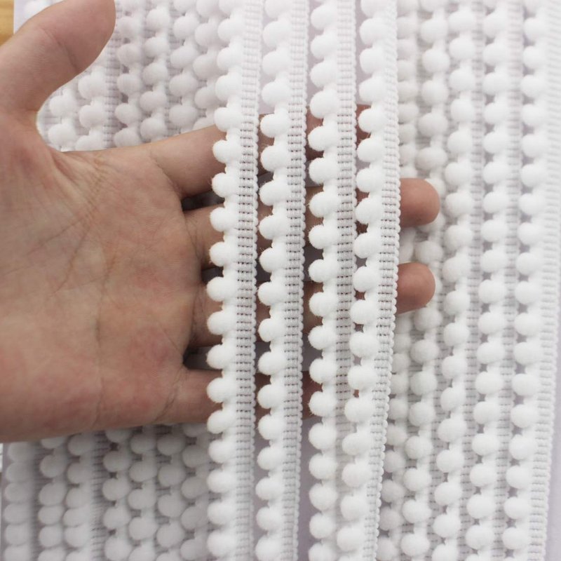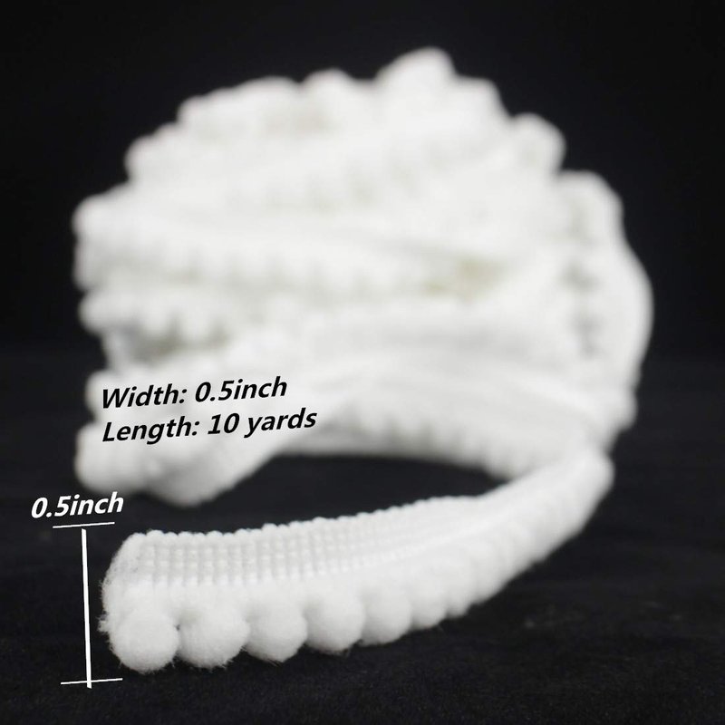 - Mini Pom Poms Ribbon White Pom Pom Ball Fringe Trim Tassel Sewing Trim Before buying, check the size of the product (width: about 1.2CM). Now we are selling small balls, which are suitable for all kinds of small decorations. We will put the large balls on the shelves in a while, so stay tuned!