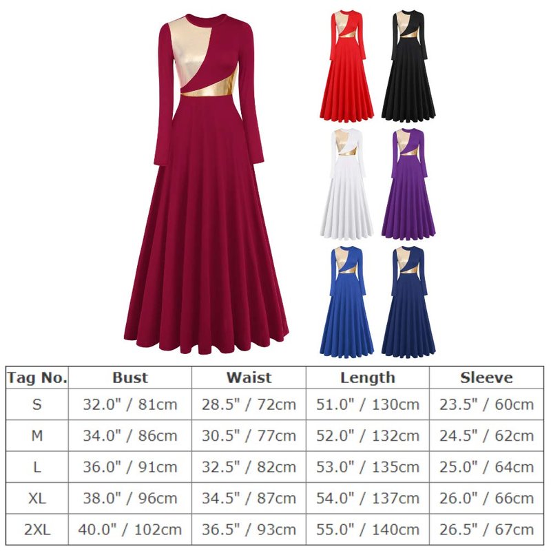 - ♣♣ 【Exquisite Metallic Color Block Design】Elegant women long sleeve praise dance dress, metallic gold color block spliced design top bodice, unique from solid plain praise dress. Women holy communion praise dresses, features classic long sleeves, modest round neckline, pull on closure and loose fit design. Metallic dancewear dress generously flared body with an ultra full sweep skirt, wide flowy swing dresses give you enough space to move, beautiful for dancing and twirling