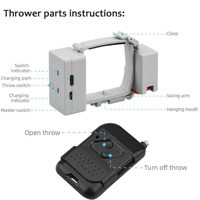 3. The thrower is equipped with Type-C port data cable, the built-in battery capacity is 150mAh, charging only takes 1.5 hours, the standby time reaches 12 hours, and the maximum remote control distance can reach 100 meters. Realize accurate long-distance delivery.