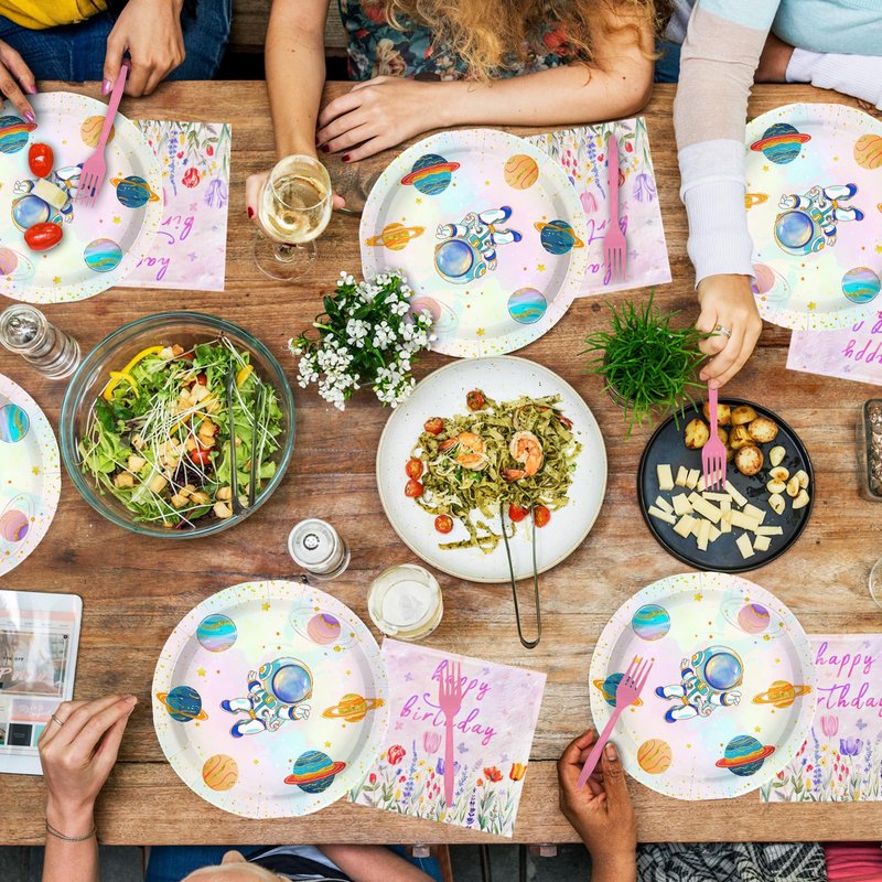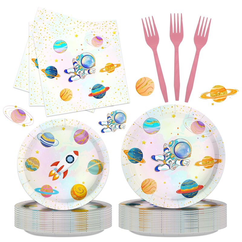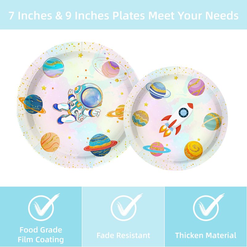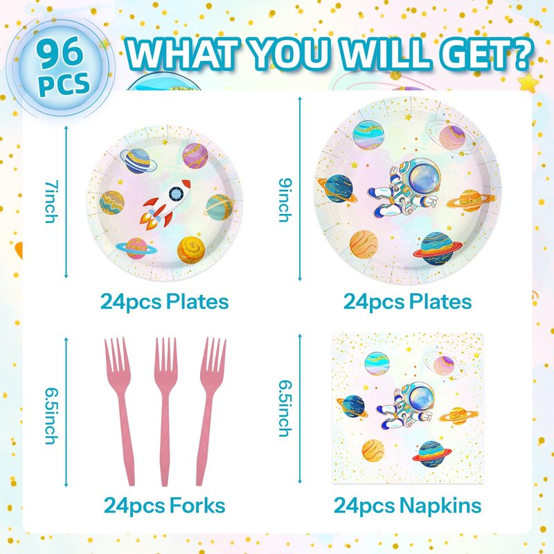 - Astronaut Party Decorations:Elevate your birthday celebration with our space birthday party decorations package for 24 guests. This set includes 24 space plates (9 in), 24 space plates dessert plates (7 in), 24 napkins (6.5 in), and 24 forks (6.5 in)