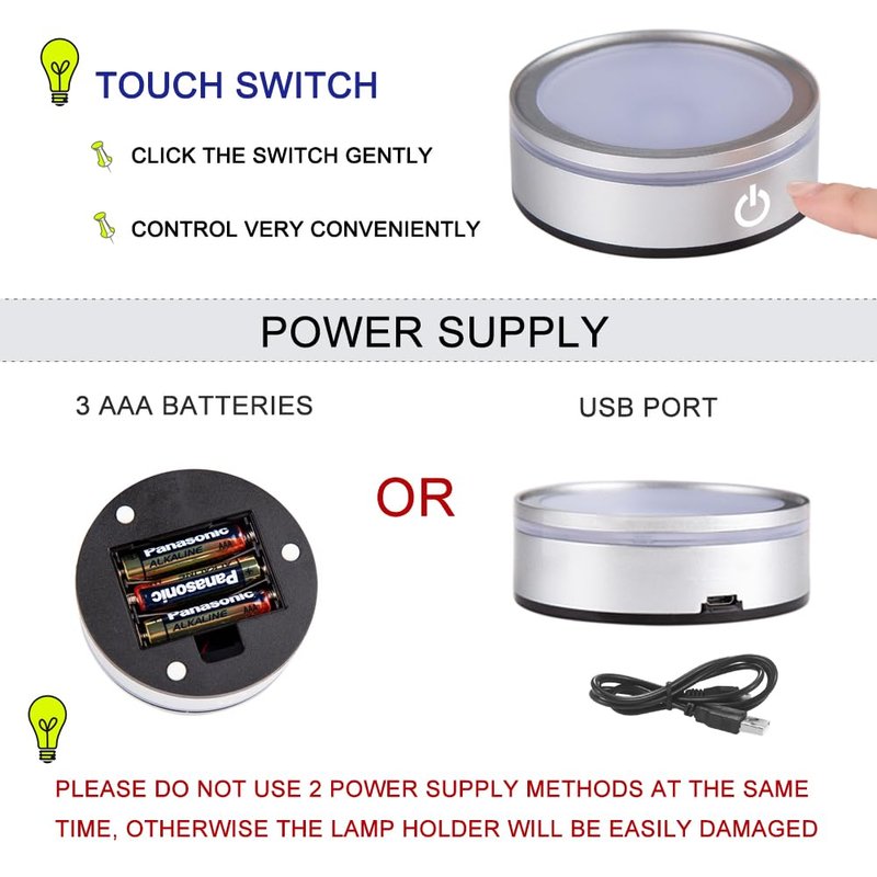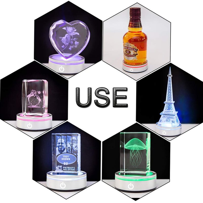 Product Features: 1. High-quality Electronic Integrated Circuits 2. Equipped with Touch Switch, Allows You to Control Very Conveniently. 3. You Will Have 6 Different Lighting Modes As Colors Slow Flashing, Colors Quick Flashing, Constant White Light, Constant Red Light, Constant Blue Light, Constant Green Light. 4. 2 Kinds of Power Supply Way: 3 AAA Batteries (not Provided by the Seller), USB Port (Such as PC, Car, Power Bank, etc.). 5. Laser LED Lamp Stand Base, Brings Magical Splendor and Charm to the 2D or 3D Crystal Crafts. 6. Unique Design and Exquisite Craftsmanship, the Amazing Display Platform for Crystal Crafts, Glass Crafts, Acrylic Crafts and Etc. Specification: Size of LED Base: 80*80*27 mm Size of packing box: 90*80*30mm Overall weight: 80g Package: 1 x LED Base 1 x Data Cable