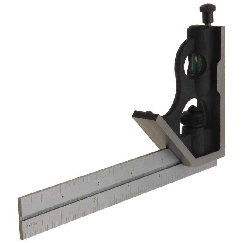 This premium square features a 6 Inch blade and a cast iron square/miter head with 45 degree and 90 degree precision ground faces. The adjustable head may be locked securely in any position along the precision ground, satin chrome finished steel blade. The hardened and tempered blade features etched machine divided graduations in 1/8 Inch and 1/16 Inch on one side and 1/32 Inch and 1/64 Inch on the other. The square/miter head incorporates a spirit level and hardened scriber. The square comes packaged in a padded plastic storage case.