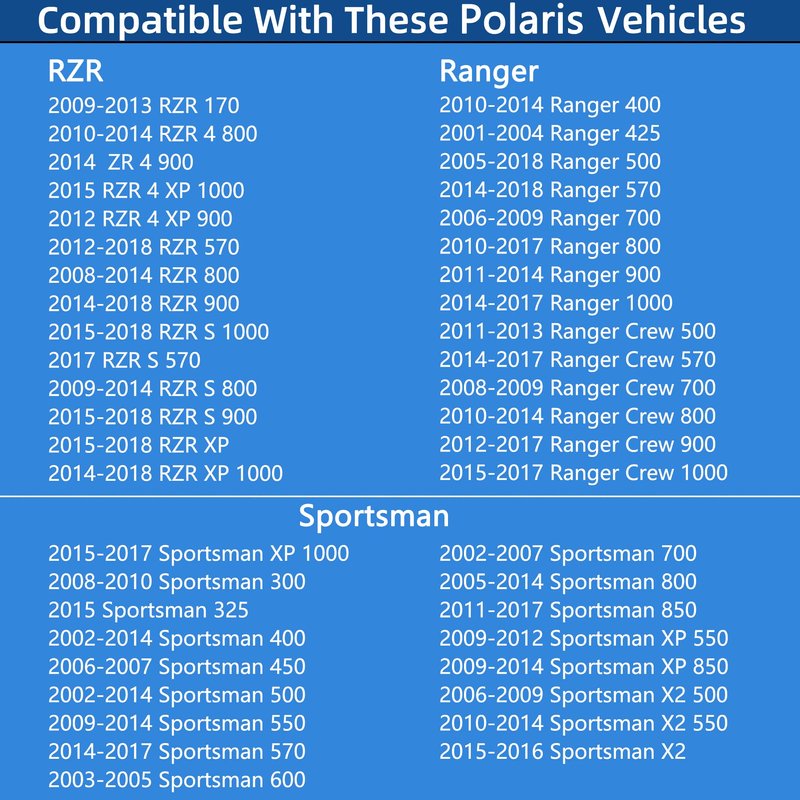 - 【COMPATIBLE WITH Polaris Ranger】 Compatible With 2010-2014 Ranger 400 | 2001-2004 Ranger 425 | 2005-2018 Ranger 500 | 2014-2018 Ranger 570 | 2006-2009 Ranger 700 | 2010-2017 Ranger 800 | 2011-2014 Ranger 900 | 2014-2017 Ranger 1000 | 2011-2013 Ranger Crew 500 | 2014-2017 Ranger Crew 570 | 2008-2009 Ranger Crew 700 | 2010-2014 Ranger Crew 800 | 12-17 Crew 900 | 15-17 Crew 1000 | 16-18 Crew XP | 10-18 Ranger EV | 09-2010 HD | 17-18 XP 1000 | 16 XP 570 | 05-09 XP 700 | 10-14 XP 800 | 12-16 XP 900