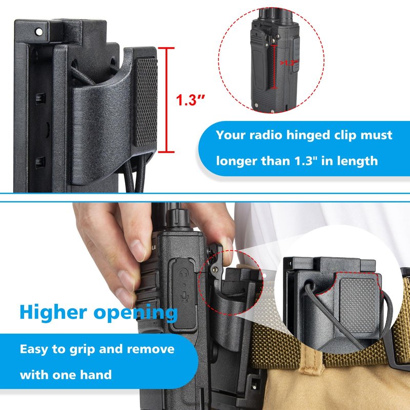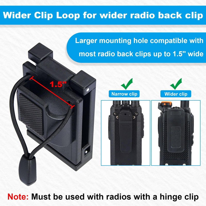 - Wider Clip Loop: We have widened the clip loop of the walkie talkie holder to make it compatible with wider radio back clips. And the top of the clip ring is raised to make it easier and faster to remove the walkie-talkie.
