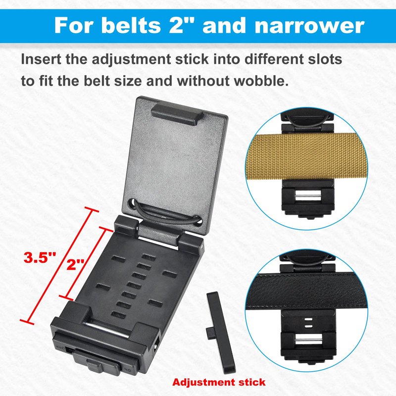 - ONLY Fits Belts Up To 2'' : This quick release radio belt clip is used for a variety of duty belts, regular belts, molle vests, etc, which comes with an adjustable bar for width adjustment, so that even narrower belts will fit perfectly without wobbling.