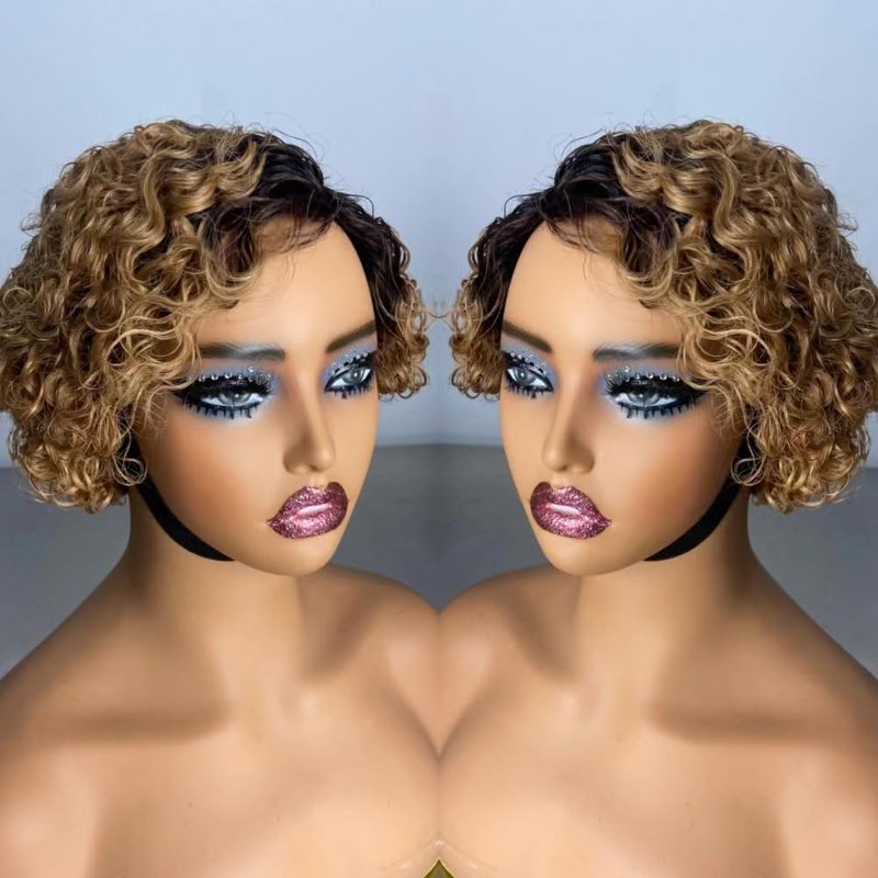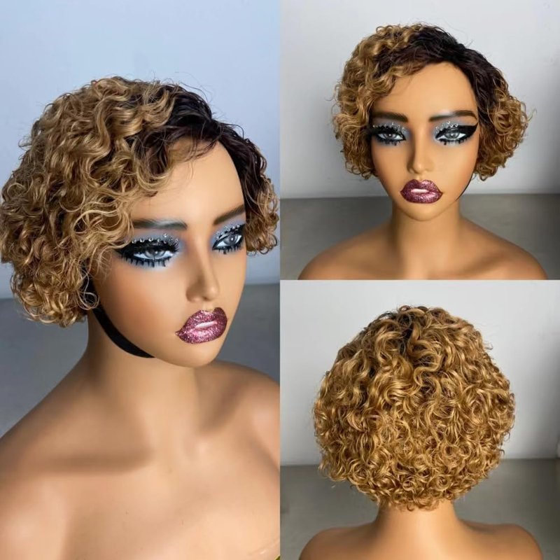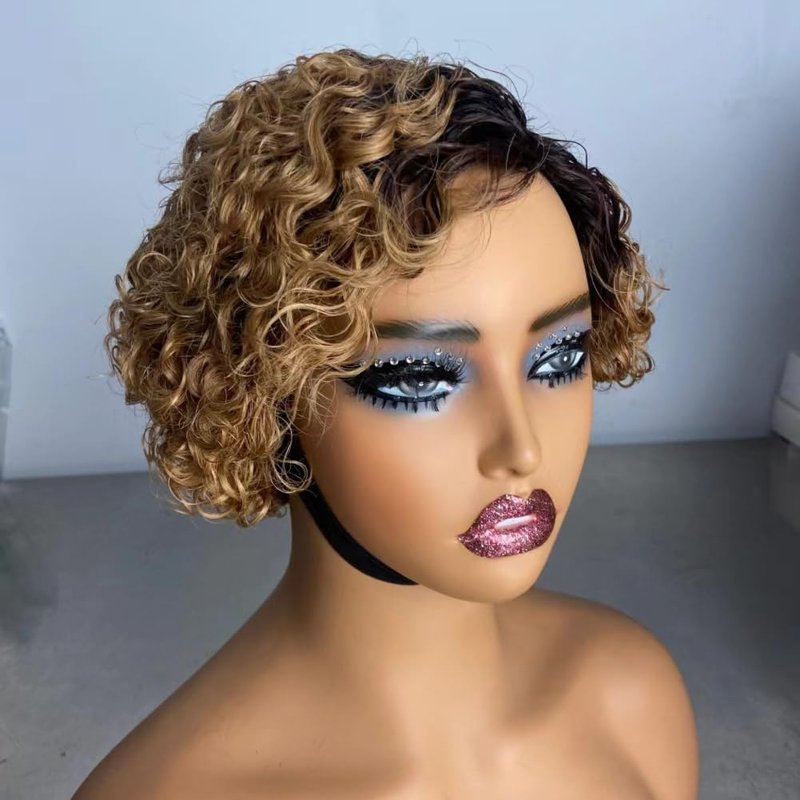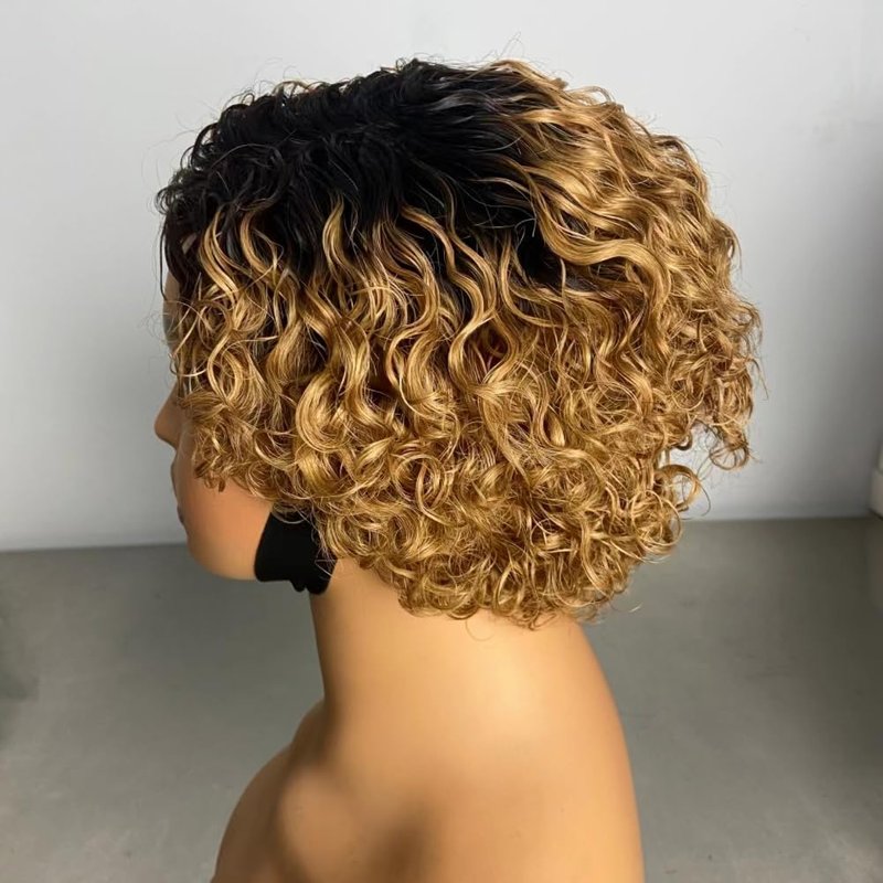 Iianaebeh Short Curly Human Hair Wigs for Black Women, Side Part Wig, Pixie Cut Brazilian Remy Human Hair, Deep Curly None Lace Front Ombre Blonde Wigs (T30)