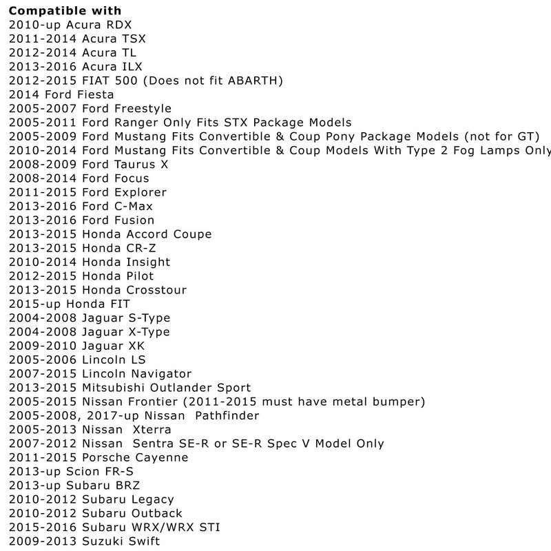 - Compatible with 2010-up RDX, 2011-2014 TSX, 2012-2014 TL, 2013-2016 ILX, 2013-2015 CR-Z, 2010-2014 Insight, 2012-2015 Pilot, 2013-2015 Crosstour, 2015-up FIT, 2013-2015 Outlander Sport, 2005-2015 Frontier (w/ Metal bumper), 2005-2008, 2017-up Pathfinder, 2005-2013 Xterra, 2007-2012 Sentra SE-R, 2013-up FR-S, 2013-up BRZ, 2010-2012 Legacy, 2010-2012 Outback, 2015-2016 WRX/WRX STI, 2009-2013 Swift