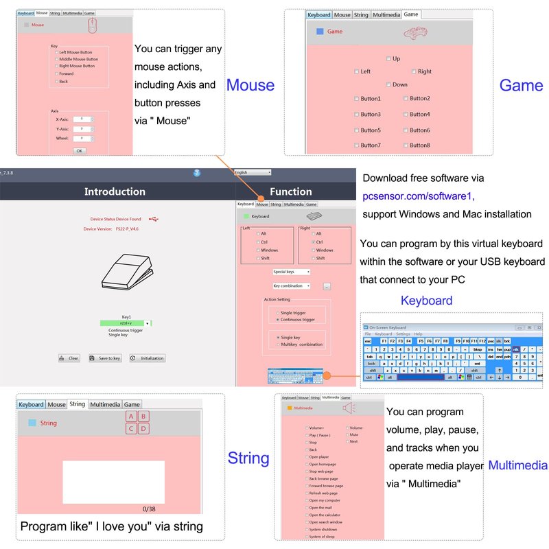 - EASY TO USE - Plug and Play, software free download from our website, software is easy to setup, and did most of what you would want to of a product, emulation various forms of input. You can assgin many different actions to the pedal, Keyboard/Mouse/String/Multimedia/Game.