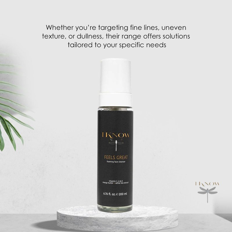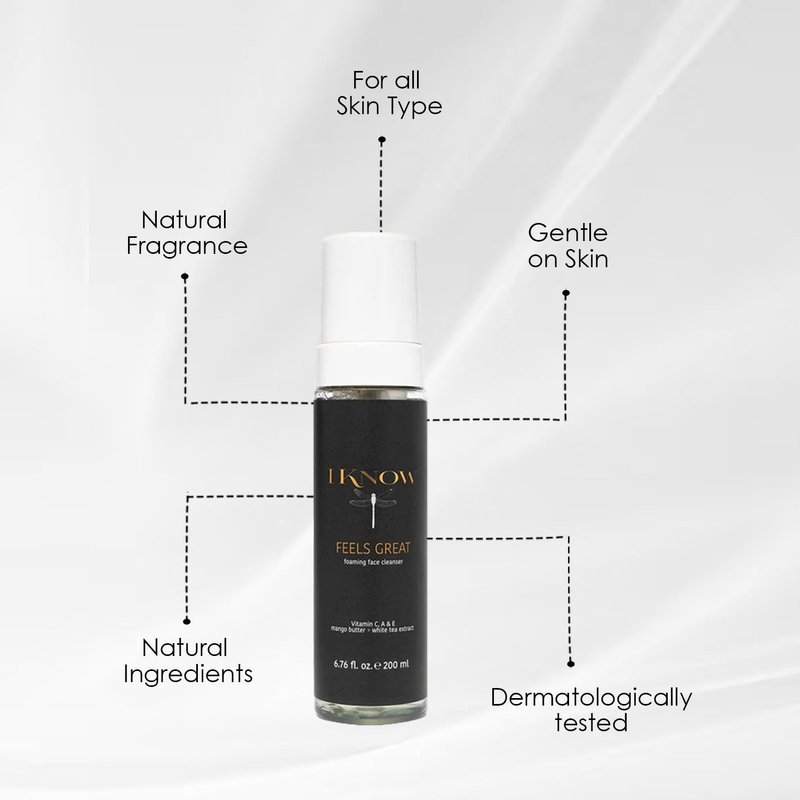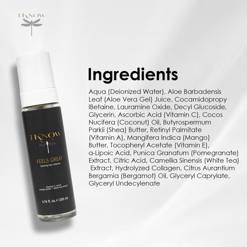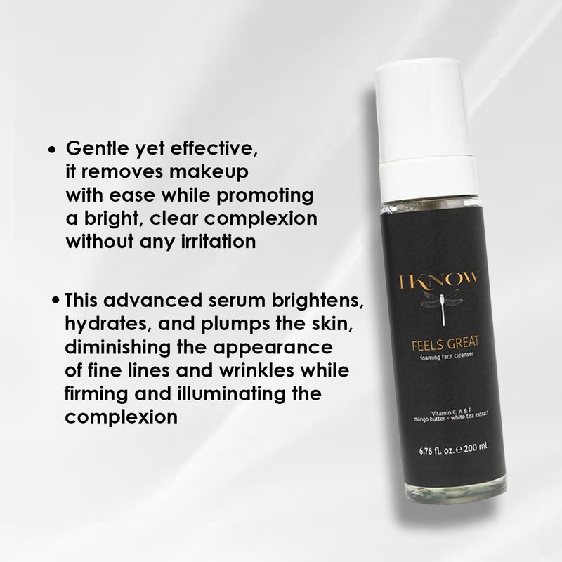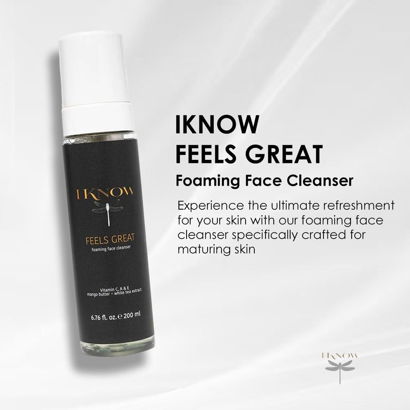 Embrace the luxury of rejuvenation with our IKNOW FEELS GREAT Foaming Face Cleanser. Specifically crafted for maturing skin, this deeply cleansing formula purifies, smooths, and softens your complexion, leaving it glowing with vitality. Infused with nature's finest treasures, this foaming cleanser is your secret to maintaining youthful, radiant skin. It is your key to maintaining youthful, radiant skin. With its blend of soothing aloe vera, firming collagen peptides, moisturizing mango butter, and antioxidant-rich white tea extract, this cleanser provides a comprehensive skincare solution for maturing skin.