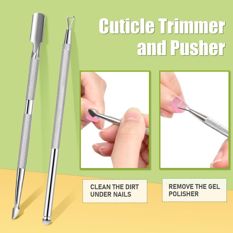 - Cuticle Peeler and Cuticle Pusher: Made from durable and sturdy stainless steel. The handle is designed with an ergonomic rounded and positive grip texture, a non-slip grip for easy control. Triangle design cuticle peeler helps to remove the gel polish cuticle precisely and quickly, no damage to your nail surface, better control to remove nails. The cuticle pusher safely removes gel polish or acrylic and the pusher cutter can scrape or cut away your dead skin.